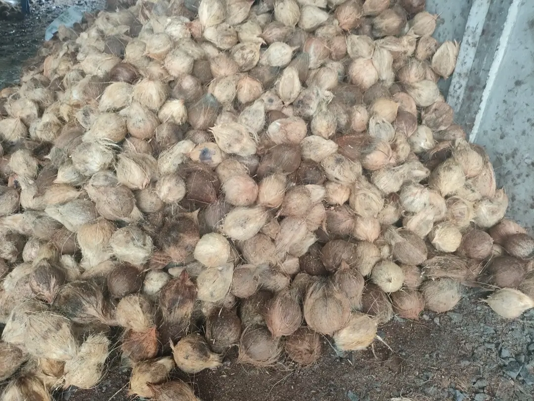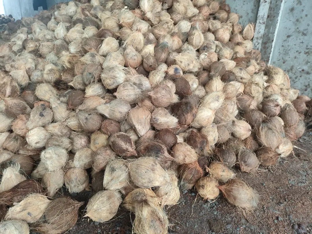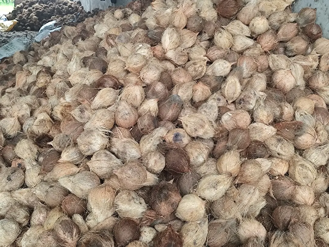 Naturally dried whole coconut husks — ideal raw material for coir production and various industrial uses.